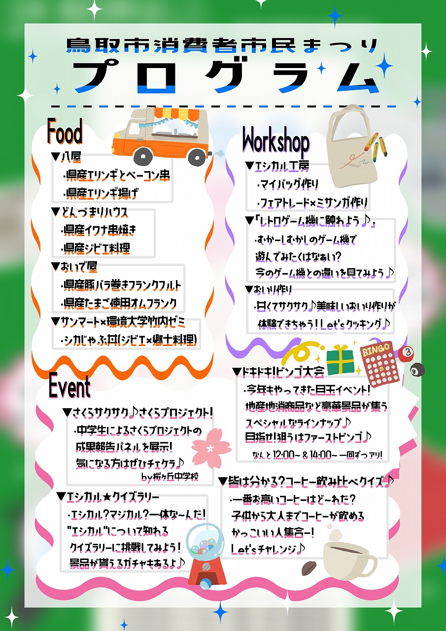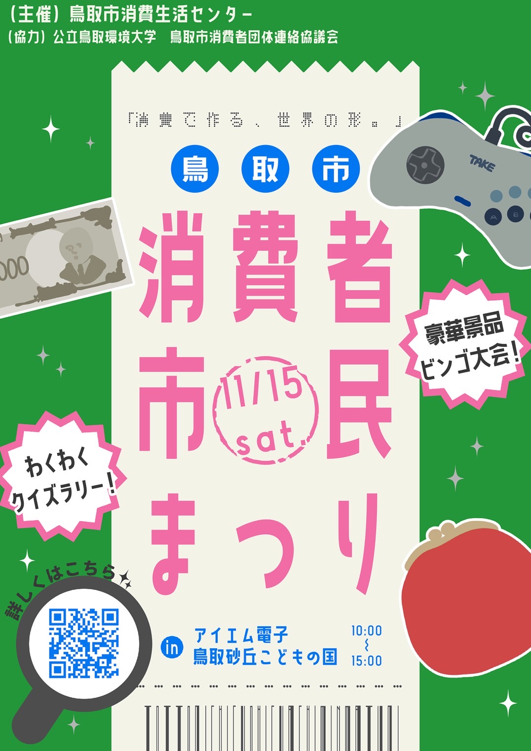 竹内ゼミでは、エシカル消費や地産地消、消費者教育というものについて、消費者であるみなさんにもっと身近に感じてもらい、体験してもらうため、今年度も鳥取市消費生活センターとの共催で、消費者市民まつりを企画しました。