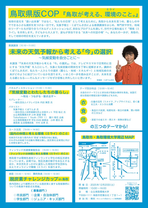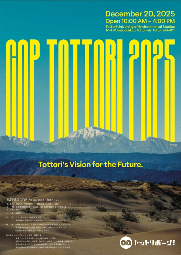 鳥取県と本学及び鳥取県地球温暖化防止活動推進センターの共催により、本学を会場に「COP TOTTORI 2025」を開催します。