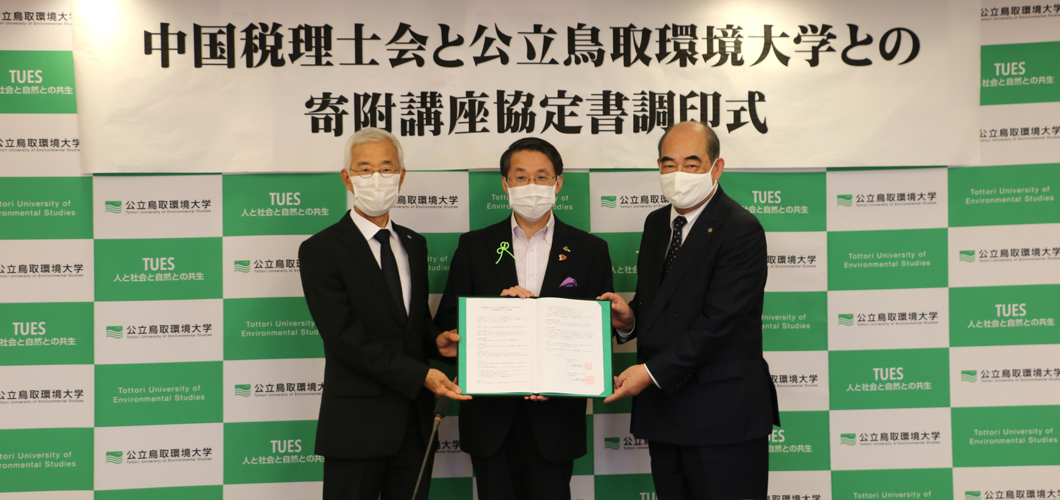 締結式では、寄附講座の地方税に関する講義を鳥取県職員が行われることから、平井鳥取県知事に立会人として参加いただき、寄附講座開設にあたって、期待のお言葉をいただきました。