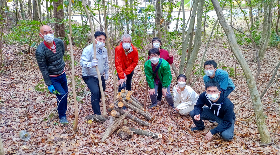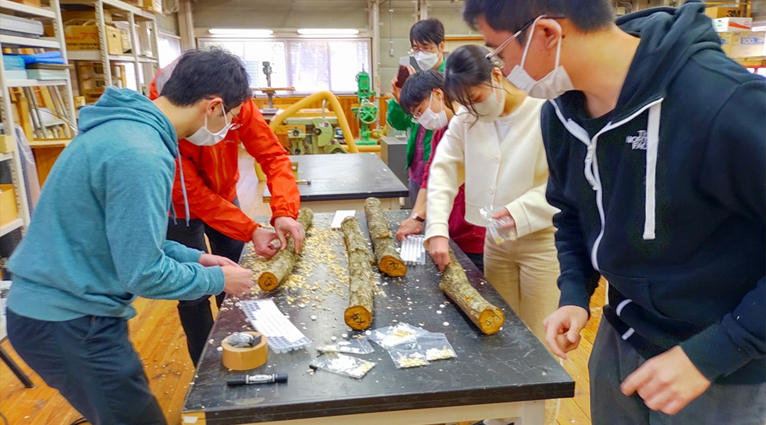 本学と鳥取商工会議所工業部会とのSDGs連携事業(※1)において、工業部会員である菌興椎茸協同組合の課題を解決するため、環境学部 金相烈 教授とそのゼミ生が、令和4年3月25日(金)に、原木しいたけ(ナラ等の原木に生える椎茸)の栽培実験を開始しました。
