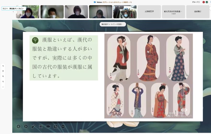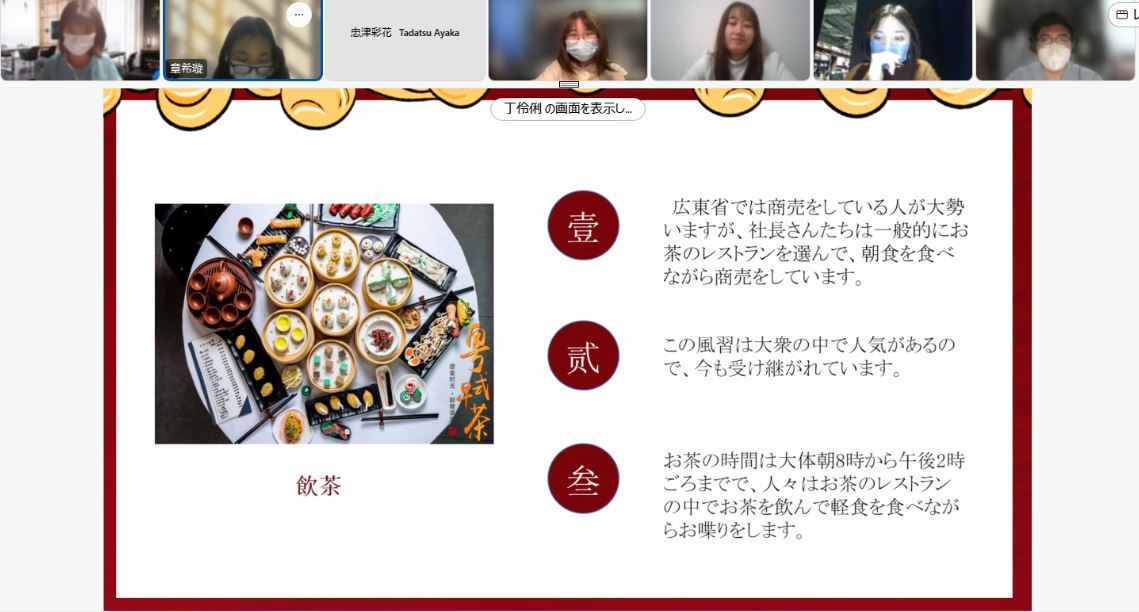 本学の学生と吉林大学外国語学院学生の相互発表では、各自の出身地とともに、自国の食文化、伝統的な衣装、漫画、小説などについても紹介し合い、とても楽しく交流することができました。