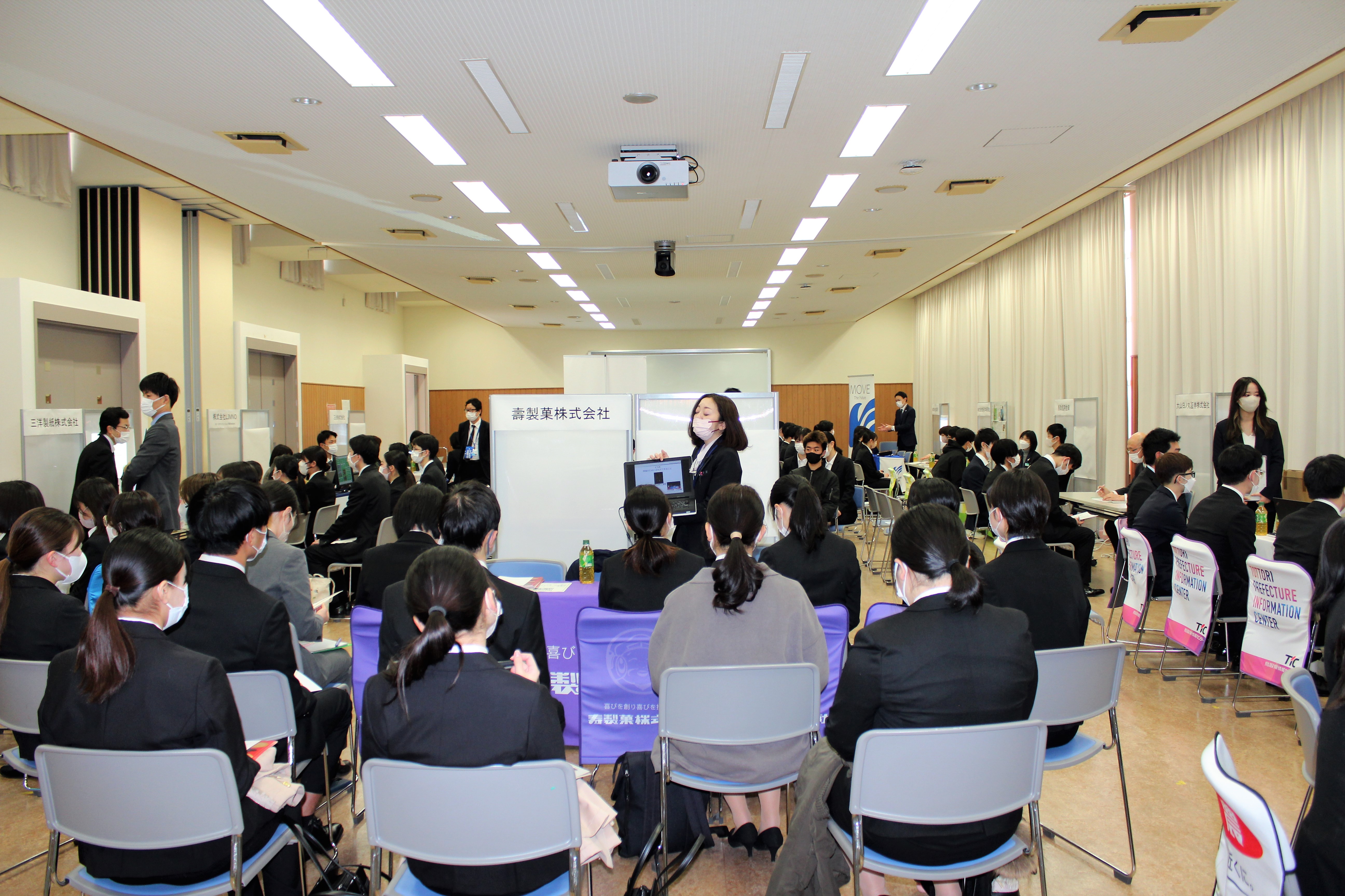 本学主催のこのセミナーでは、県内に本社を置くIT企業や製造業、金融機関など14社が、それぞれの会社の強みや社会での役割など地元企業の魅力を伝えていただきました。このセミナーを対面で開催するのは3年ぶりで、参加した学生は真剣な表情で担当者の話を聞きながらメモを取ったり、質問を行ったりしていました。