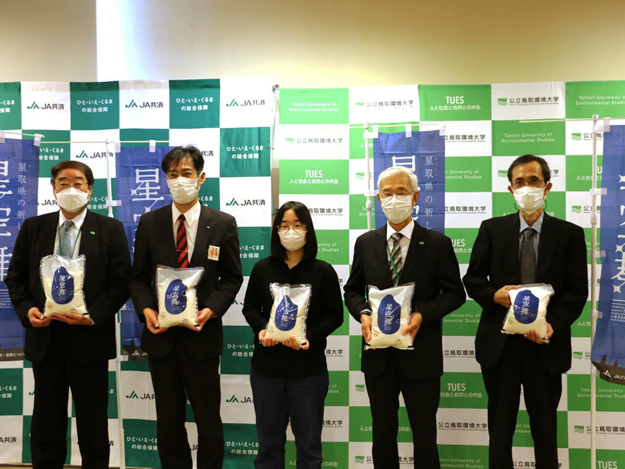 令和4年4月12日(火)、鳥取県内の3JA(JA鳥取いなば、JA鳥取中央、JA鳥取西部)とJA共済連鳥取より、コロナ禍の中で生活する本学学生を支援することを目的に、鳥取県産米「星空舞」400kg(2kg×200袋)を寄贈いただきました。「星空舞」は鳥取県産のブランド米で、寄贈者のJA共済連鳥取の山西裕祐副本部長は、「星のように輝く県産のお米を食べて健やかに過ごしてほしい」と本学学生に支援の言葉を語りました。 寄贈式では、学友会副会長の佐藤わかばさん(環境学部3年生)が、学生を代表してこのたびの寄贈への御礼を述べました。